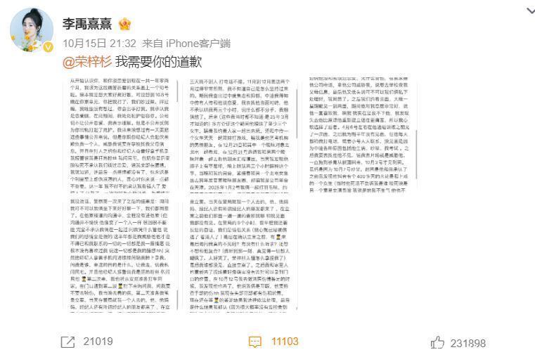 看到荣梓杉的回应,李禹熹认为荣梓杉不但没道歉,还造谣她,将事情做得太绝了。