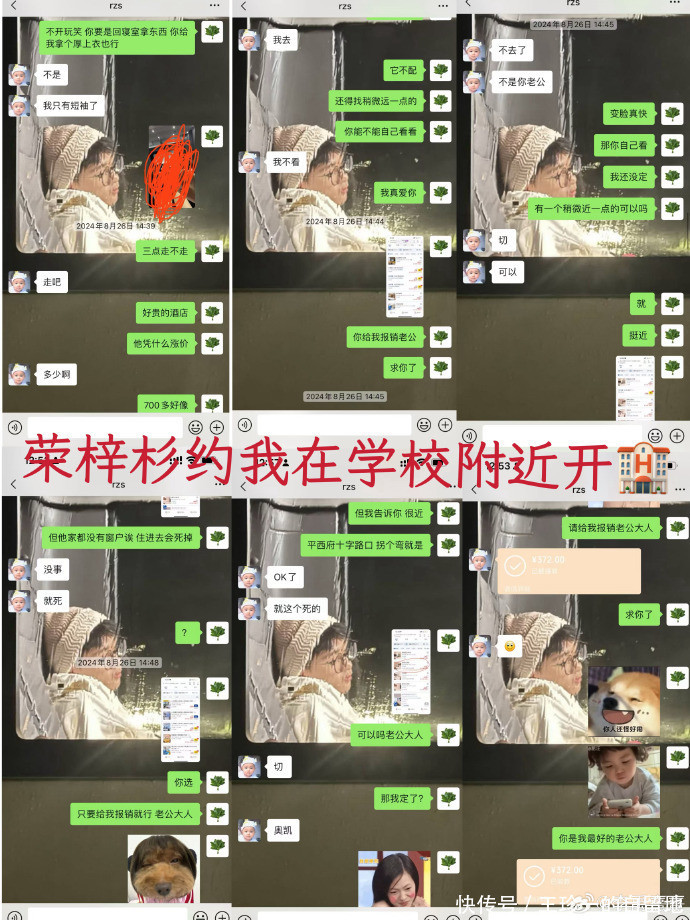 这些聊天记录甚至有荣梓杉约李禹熹去酒店“咏鹅”的内容,并且他很抠门,舍不得花钱,最后去了372元不带窗户的酒店,并在女方的要求下,他才报销了订酒店的钱。