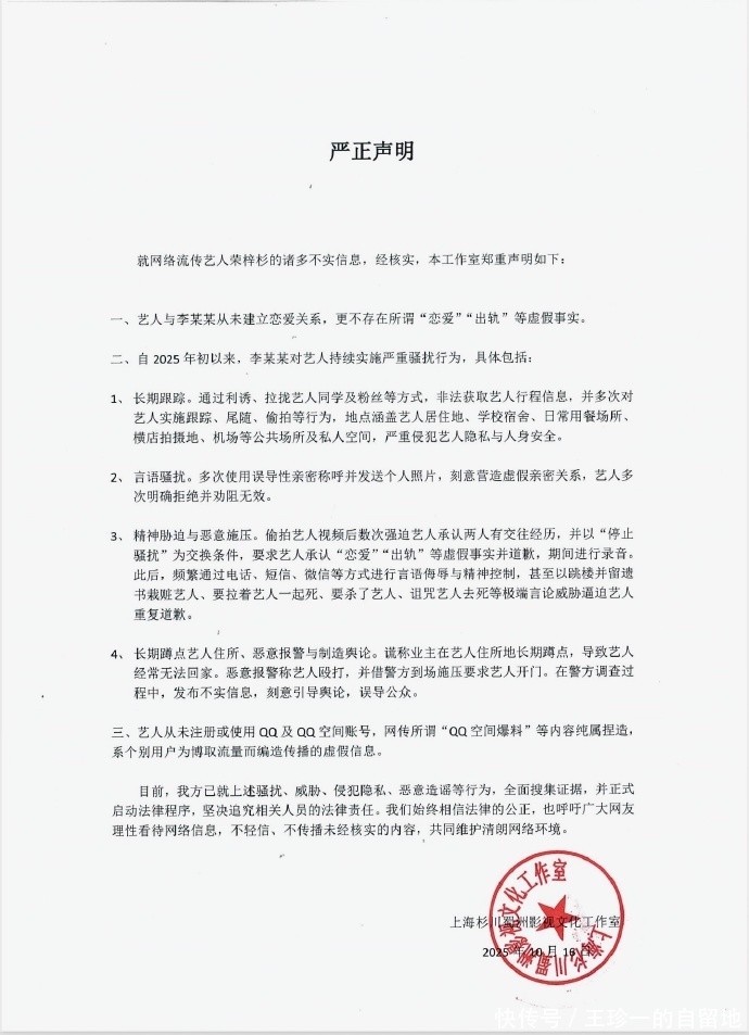 声明中还指控李禹熹跟踪、尾随、偷拍荣梓杉,指控李禹熹恶意报警、制造舆论,对荣梓杉进行精神胁迫。