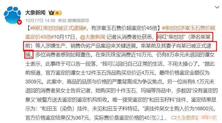 如今柴怼怼彻底栽了,10月17日,柴怼怼被正式逮捕的消息登上了热搜。