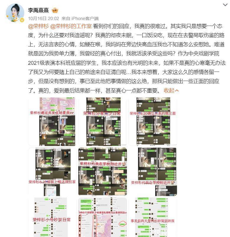 10月15日晚,李禹熹突然发长文控诉荣梓杉,她说他们恋爱了一年2个月,在恋爱3个月后,荣梓杉开始对她进行冷暴力。