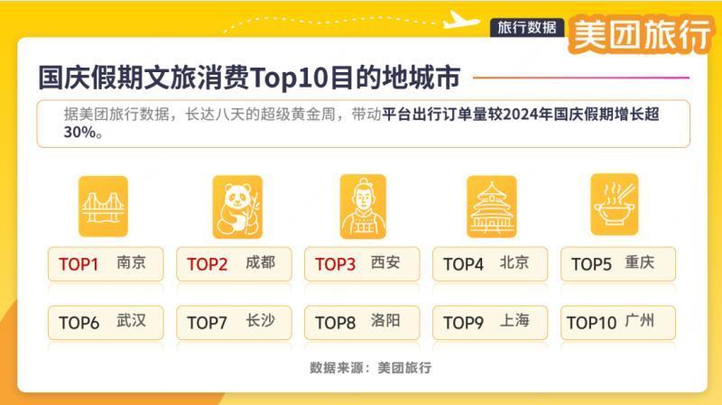 长沙晚报掌上长沙10月8日讯(全媒体记者 吴鑫矾 通讯员 隽蒙)10月8日,美团旅行发布数据显示,今年国庆中秋假期平台出行订单量较2024年增长超30%,文旅消费Top10目的地城市分别为南京、成都、西安、北京、重庆、武汉、长沙、洛阳、上海、广州。此外,在假期酒店预订增幅前十目的地中,第五届湖南旅发大会举办地怀化上榜。