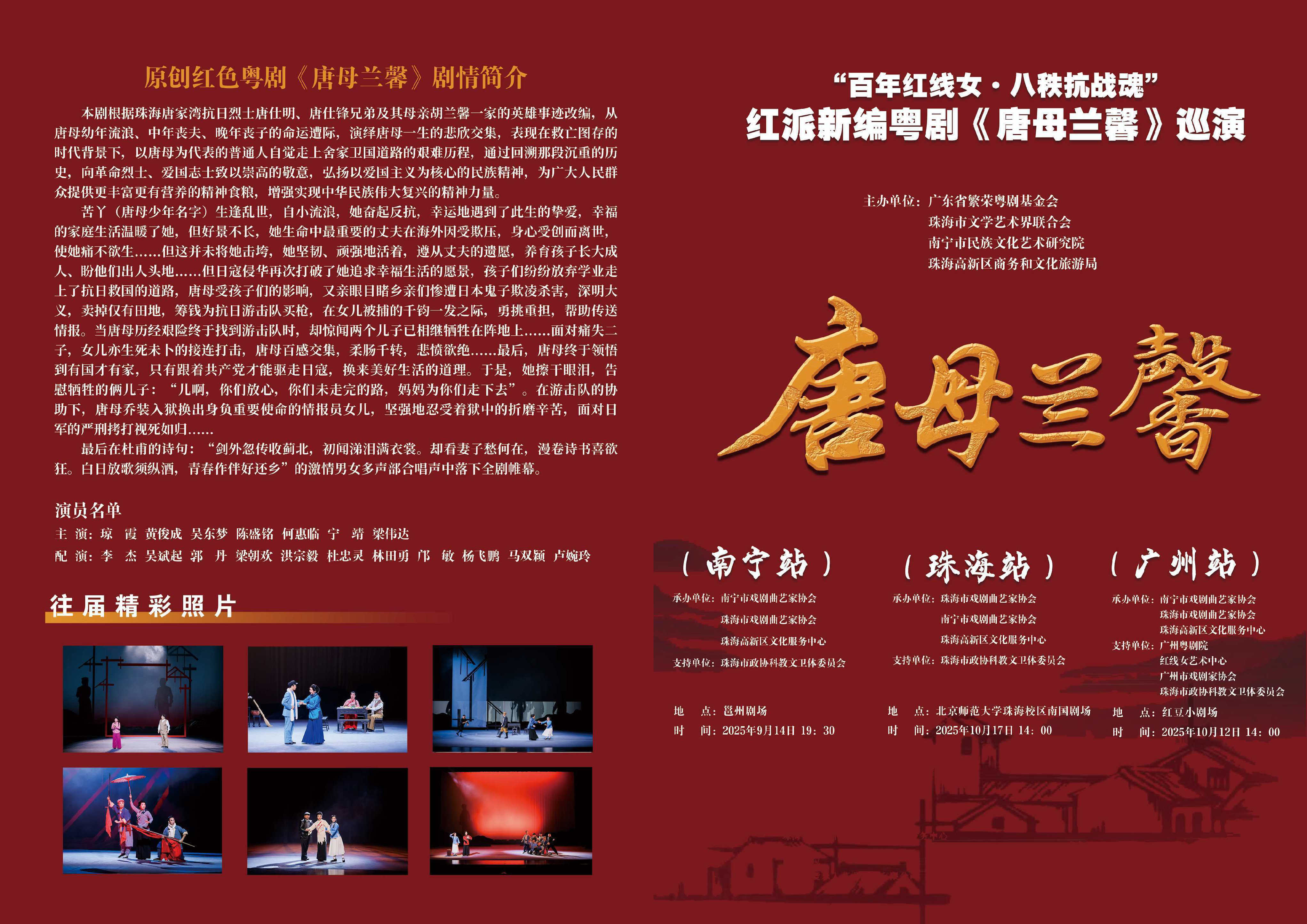 此次巡演的首部核心剧目,是红派新编粤剧《唐母兰馨》。该剧取材于珠海唐家湾抗日烈士家庭的真实事迹,以唐母胡兰馨的人生轨迹为主线,生动展现其从幼年乱世流浪、中年丧夫育儿,到日寇侵华时舍田筹钱支援抗日、勇救被捕女儿,即便痛失两子仍坚守“有国才有家”信念的动人历程。
