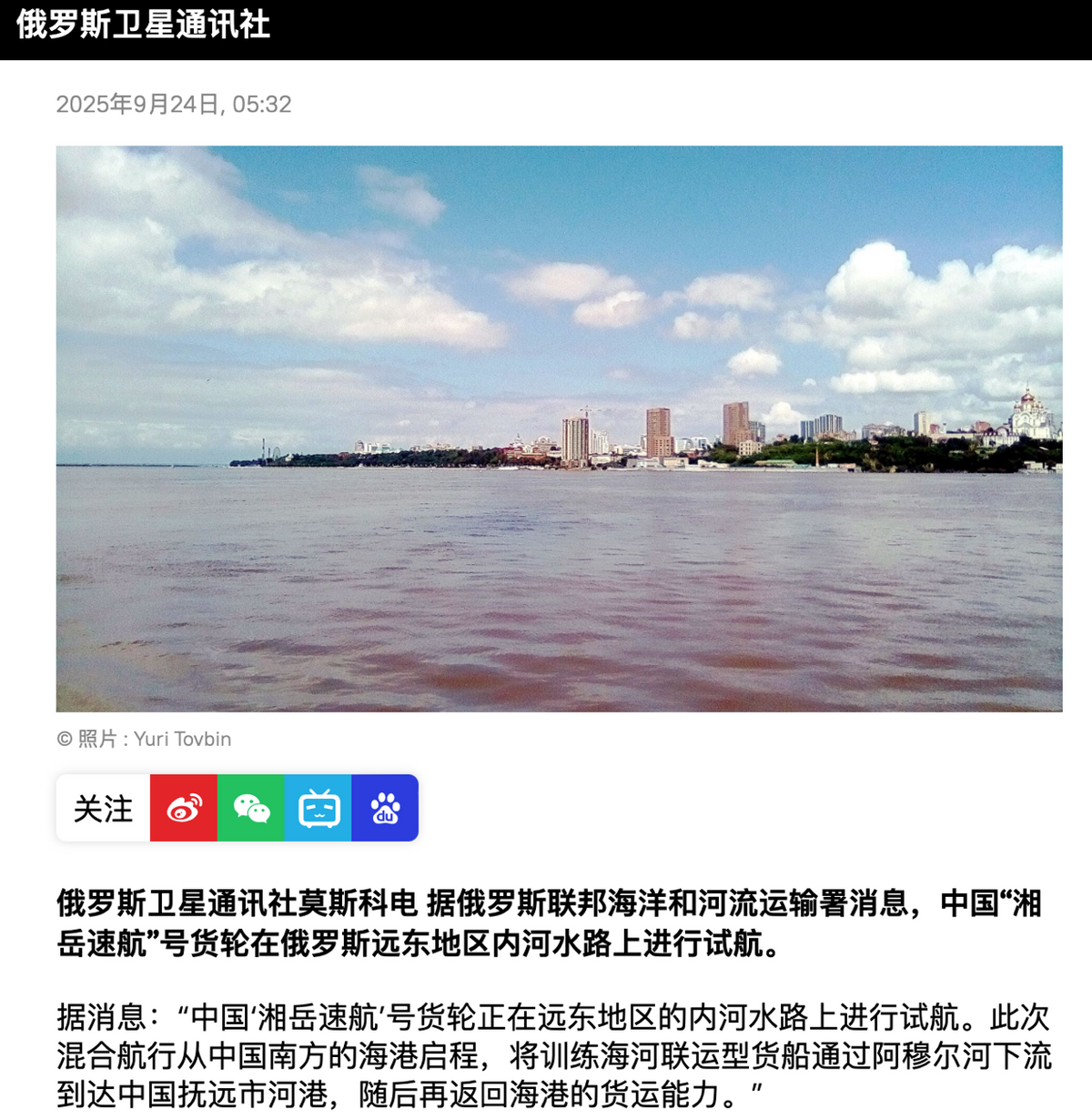 俄卫星社报道,我方货轮在俄远东地区内河水路上首次试航,这标志着我国东北地区经由黑龙江、阿穆尔河通往海洋的出海口真的来了。俄联邦海洋和河流运输署发布消息称,我方湘岳速航号货轮从苏州太仓港出发,先抵达库页岛以东的瓦尼诺港,然后进入远东内河一路向西航行,最终停靠于黑龙江抚远港,成功验证了“海河联运交通走廊”模式。简单来说,就是中俄共同利用俄远东的阿穆尔河等内河,以及黑龙江和乌苏里江,成功开辟东北地区经由这些江河直达日本海,再联通我国沿海乃至世界各地的水上战略通道。俄媒称,这大大出乎一直密切关注此事的美国和日本方面的意料,因为在美日的研判中,中俄应该是在中俄朝交界处建设出海口,以达到从海上直通东北的战略目的。所以对于中俄此举,美日方面认为“简直不按常理出牌”。而现实是,中俄选择了更加北边的,夹在库页岛和哈巴罗夫斯克边疆区之间的瓦尼诺港作为海河联运的转运点。执行此次首航的湘岳速航号货轮具备同时在内河与海上航行的能力,它先是向俄远东地区运去了大量工程用工具货物,然后再用集装箱满载来自东北、俄远东地区的粮食返回苏州太仓港,完成了一次成功的互补性海上贸易。根据俄中国境河流航行联合委员会的通报,“东北—俄远东”联运水上走廊在由海上转入内河后,主要依托3000公里长的阿穆尔河进行转运。为此,双方共同投资对河道进行疏浚,以增加运力。此外,作为连接海运和内河航运的关键节点港口,瓦尼诺港也获得充足投资,将扩建成俄罗斯在远东的门户型海港。分析指出,中俄在库页岛以东为东北-远东地区打造全新出海口,显然充分考虑到了保护海上战略通道的安全问题。俄媒强调,东大海军舰队,空军远程轰炸机、加油机、战斗机和无人机等,都多次在远东地区与俄军进行联演联训,并且与俄方明确宣示要提升共同保护战略通道的能力。俄媒最后表示,从某种程度上来说,美日所谓“不按常理出牌”的说法并没有错,反而恰恰是因为打破了常规,“东北—俄远东”联运水上走廊才得避免更多掣肘顺利开通运营。